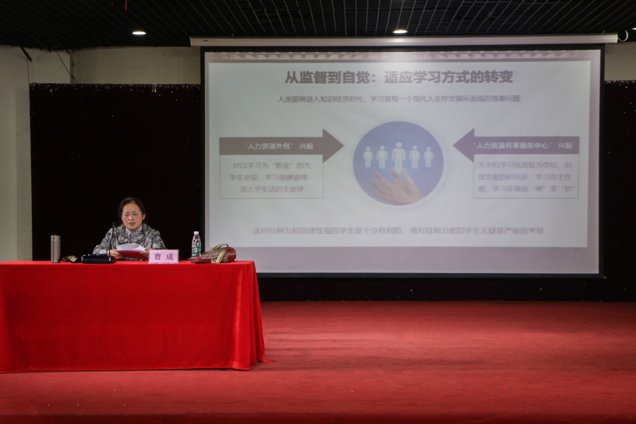 讲座伊始,曹老师从“00后”的心理发展特点和规律入手,提出新生要适应大学新环境,才能把握成才主动权。她从中学到大学、考试到深造、感性到理性、监督到自觉、依赖到独立、旧友到新友六个角度,勉励新生要适应社会角色、奋斗目标、思维方式、学习方式、生活方式和交往方式的转变,做到勤学而不懈怠、扎实而不浮躁、谦虚而不自矜、创新而不因循。讲座结束,同学们纷纷表示要重新自我定位与规划,以全新的精神面貌迎接大学生活带来的机遇与挑战。