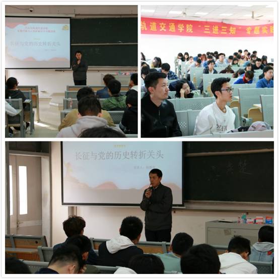 为深入开展“不忘初心、牢记使命”主题教育,引导学生铭记历史,传承红色精神,激发爱国热情,11月13日下午,汽车与轨道交通学院在东B302举办“长征与党的历史转折关头”专题讲座。该院院长、车辆182班第二班主任赵振东担任主讲,该院2018级入党积极分子、党员发展对象和车辆182班全体学生共同聆听了讲座。赵院长以“长征与党的历史转折关头”为主题,为同学们详细讲解了长征的过程与意义,同学们被中国共产党人为理想信念抛头颅洒热血的伟大事迹深深感动。“和平与发展”始终是时代的主题,当代大学生出生于和平年代,但不能忘却革命先辈长征时不畏艰难的精神,他激励同学们要将长征精神融入到今后的学习、生活和工作中。通过此次讲座,同学们进一步端正了入党动机,坚定了入党信仰。讲座结束后,同学们自发交流学习心得,大家纷纷表示:“我们要认真学习长征精神,弘扬民族精神,为实现中国梦贡献自己的力量。面向未来,面对挑战,一定要不忘初心、牢记使命,走好我们这一代人的长征路。”