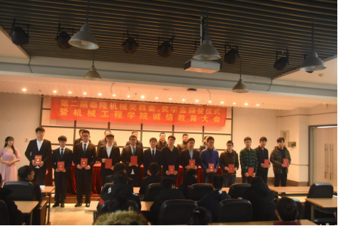 机械工程学院党委书记高成冲宣读了《机械工程学院关于表彰第二届泰隆机械奖教金、奖学金的决定》,共有李芳等9名教师获得奖教金,石佳等15名本科生获得奖学金。获奖教师和学生代表分别上台发言。机械工程学院辅导员为同学们作了以“诚信考试,诚实做人”为题的诚信教育,机械193王晟同带领200余名同学集体宣誓:从我做起,做到诚信考试、公平竞争、诚实做人。