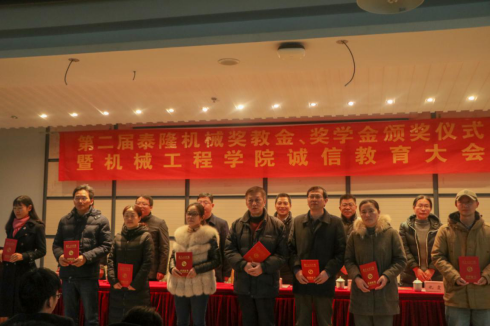 12月26日,机械工程学院第二届泰隆机械奖教金、奖学金颁奖仪式暨诚信教育大会在至勤楼·行政中心学术报告厅举行。江苏泰隆减速机股份有限公司总经理殷爱国,发展与对外合作处、机械工程学院党政负责人以及200余名师生参加了本次大会。
