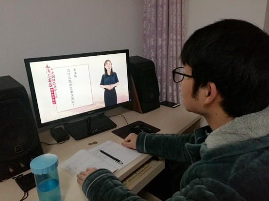 建工184班学生曹逸枫在湖北省监利县的家中晚上参加《概论》课集中辅导学习与讨论