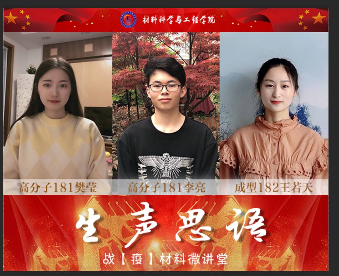 学院还开设“生声思语”战“疫”材料微讲堂,在发挥教师主导性的同时,调动材料学子的主动性,引导学生主动思考将自己所学专业运用到社会主义现代化建设之中。高分子181班樊莹同学讲道:“疫情阻击战中,习总书记强调要调动综合多学科力量合力攻关,而作为众学科基础的材料科学在这场大战中发挥了重要作用。我们要努力学好科学文化知识,理论联系实际,不断提升综合素养,做新时代‘硬核’材料人。”