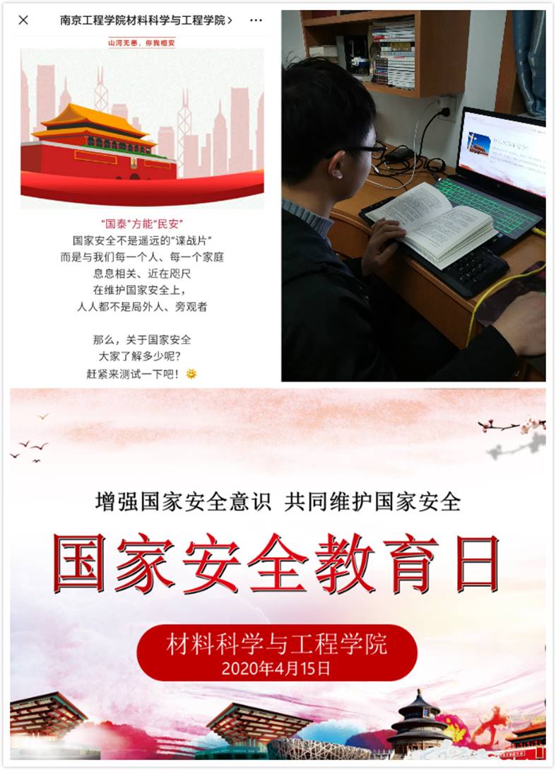 4月15日是第5个全民国家安全教育日,为了增强材料学子的国家安全意识,坚持国家安全观,为全面建成小康社会提供坚强思想保障,学院组织开展了“4.15”全民国家安全教育日宣传教育活动。师生通过线上讨论、主题“云”班会、线上知识竞答等形式进行交流学习。会上,老师们进行有关法律文件解读,以及校园反恐、禁毒、防范新型电话网络诈骗等安全教育宣传,并与同学们进行在线连麦,分享了对上述安全问题的看法及经验。老师们还重点宣传在抗疫一线用实际行动维护公共卫生安全、捍卫国家安全的先进典型及感人事迹,积极推进国家安全意识入脑入心。