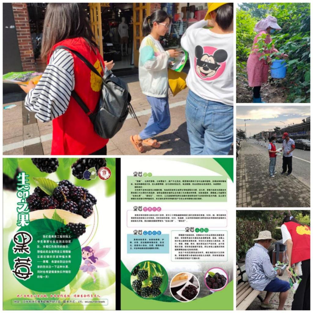 孙净村种植的水果以草莓、黑莓、蓝莓为主,如今正是黑莓上市的季节,为了更好地了解黑莓,成员们不断向果农请教并亲身体验黑莓的采摘过程。充分认识了黑莓后,小分队成员一方面绘制海报,街头宣传,并在夜市摆摊招徕顾客,一方面与镇上的黑莓食品加工厂联系,探讨电商营销黑莓加工食品的可行性,并对包装设计、产品设计等提出意见和建议。“这次活动让我们体会到了农民的辛苦,”同学们感慨道:“希望通过自己的知识帮助更多农民实现增收,推动理论学习与社会实践相融合,把个人利益与国家利益相融合,在实现全面小康的伟大实践中书写别样精彩的人生。”