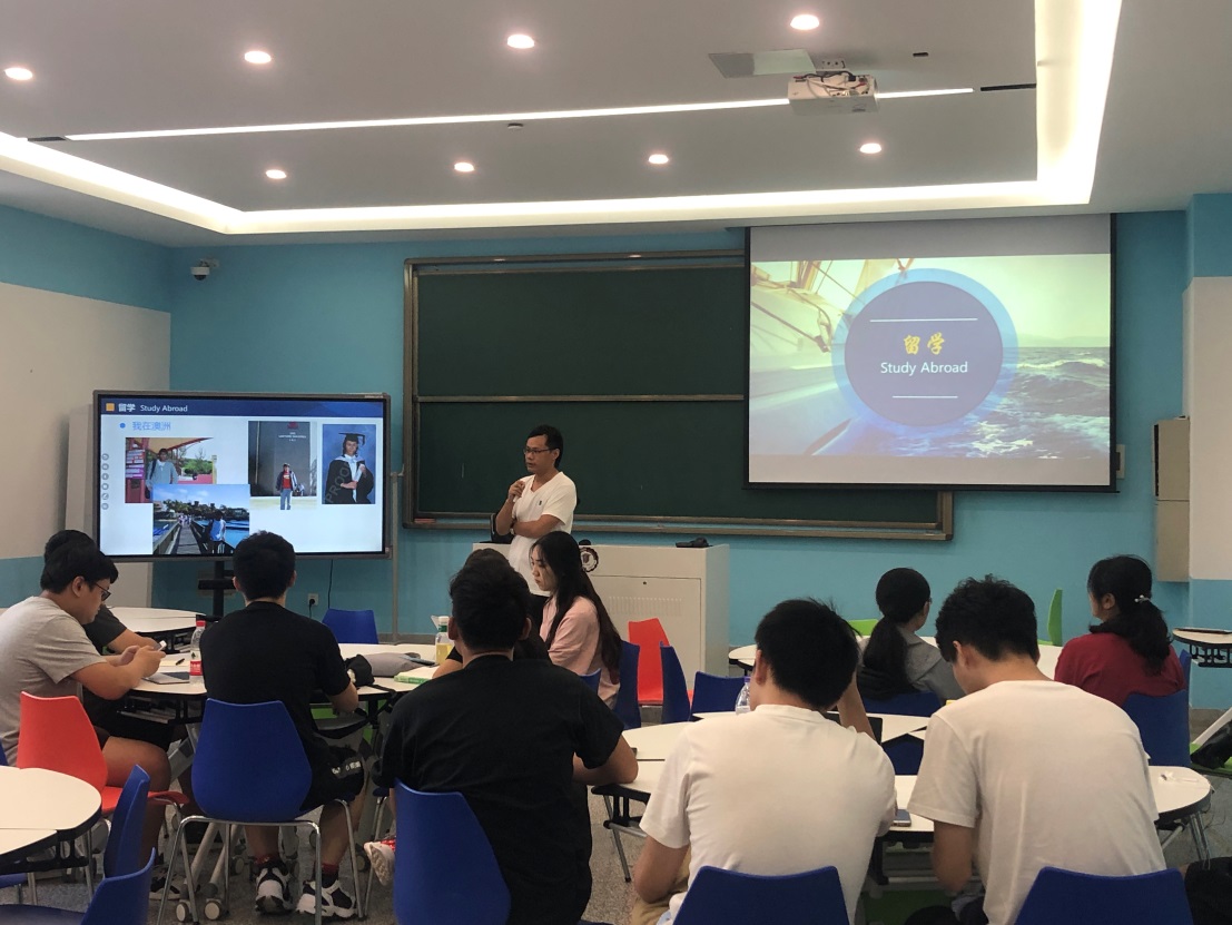 讲座中,蔡老师结合详实的数据和典型的案例以及国内本科生毕业发展趋势,从留学目的与优势、留学规划与建议等方面为同学们一一作出讲解。就软件工程专业的申请要求,他重点讲授了伦敦国王学院、曼彻斯特大学、华威大学等世界名校研究生申请的具体要求和时间节点。蔡老师强调,国外申研过程中,大学的选择、文书的撰写、语言的基础、有序的规划缺一不可。他建议同学们要着力提高思辨能力、实践能力、创新能力等核心竞争力,广泛搜集了解申研信息,结合个人兴趣与特长,及早确定专业方向和留学国家意向。互动交流环节,学生们就留学的语言要求、申请材料的准备、各个国家留学的优劣势、疫情对留学产生的影响等问题与蔡老师进行了热烈的讨论与交流。