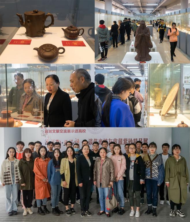 展览会现场,工作人员焦老师以时间为轴,详细向师生们讲解了宜兴紫砂壶的悠久历史和发展现状,通过历代实物紫砂壶全方位还原了宜兴紫砂的历史风貌,展现了宜兴紫砂壶的制作技艺和深厚的文化内涵。“阳羡风情天下醉,陶都神韵紫砂骄,紫砂壶是兼具实用性与艺术性的中国传统工艺品,是中国当代最富艺术表现力的传统形式之一。”焦老师介绍道。同学们在一个个紫砂精品前驻足留连,感受宜兴紫砂壶的独特魅力和风采,该院刘艳华副书记指出,学院坚持以美育人、以文化人,积极拓展美育空间、提升美育质量,并鼓励同学们要学习优秀校友精神,努力练就过硬本领,勇担时代责任与使命,做新时代文化的继承者、创新者与传播者。同时,学院将不断创新工作方式方法,增强美育教育,全面提升学生综合素质。