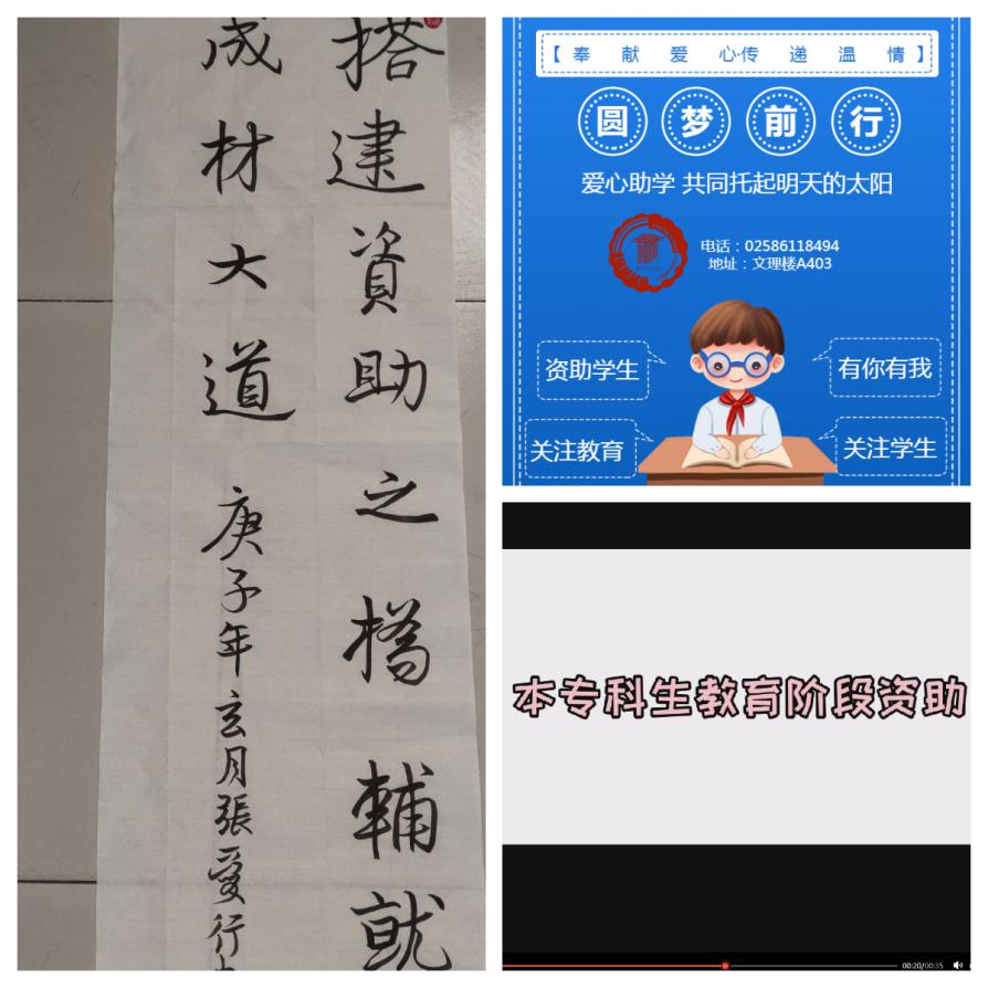 活动面向全院师生以“助学、筑梦、铸人”“资助育人”为主题,广泛征集书法作品、短视频、海报,鼓励师生以多重形式表达受助感想和对国家资助政策的感悟。通过广泛征集、学院推荐,社工192张爱行的书法作品、社工191李雪娇的短视频作品《最全资助政策来啦》以及社工181卞雨辰的海报作品脱颖而出,后期推荐参加校级评选。作品内容不仅凸显了同学们对于资助成效的见解与感悟,也呈现了新时代青年学生良好的个人品质和积极向上的价值观。