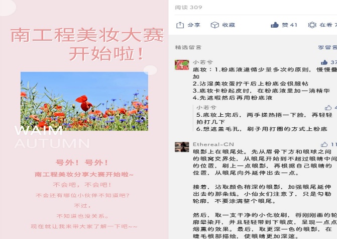 为满足女生提升自我形象的需求,学院积极开展美妆技巧交流活动,活动中,各位美妆小达人在抖音平台上发布小视频,传授化妆技巧,分享化妆雷区,还有学生对当下的流行妆容畅谈心得体会。按照浏览量与留言量,工管201吴若兮最受同学们欢迎获得了一等奖,二等奖由造价291曹宁、人力191卢媛媛斩获,三等奖颁发给了造价202宋泽一、人力191庄馨蕾、财务191张秋怡。“通过这次的美妆交流会,我对美妆有了初步的了解,终于不用担心自己不会化妆、化不好妆了。”参加活动的同学如是说。
