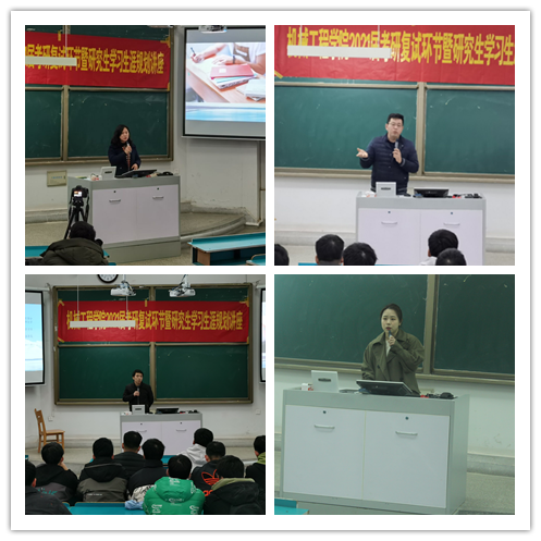 该院教师咸东鹏、荀超结合自身研究生学习、科研经验和心路历程,为准备复试的学生分析了复试准备、导师选择、调剂注意问题,帮助同学们尽快进入考研复试备考状态,鼓励大家增强信心和决心;2020年成功考取南京航天航空大学、上海大学等学校研究生的优秀毕业生也来到现场,为同学们分享成功上岸的经验和心得,鼓励大家充分利用网络资源做好复试的知识储备,利用校友资源了解复试细节,同时提醒大家摆正心态做好多种面试形式的准备;文都考研复试培训粘老师向在座同学重点介绍了复试流程和面试技巧,依次从面试的语音、语速、语调、用语规范、行为举止以及面试自我介绍的基本要点等方面,分别举例说明面试经常出现的错误行为。