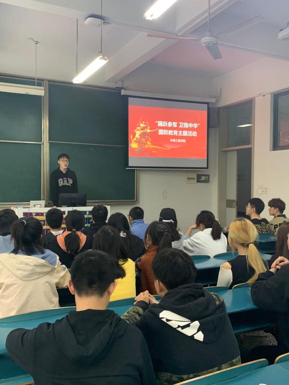 为鼓励大学生积极报名应征入伍,进一步提高国家兵员素质和征集质量,4月21日下午,环境工程学院在文理B202开展以“踊跃参军 卫我中华”为主题的国防教育主题活动。此次活动邀请校学工处人武部余笑天老师主讲,该院学工办老师和各班学生代表参会。