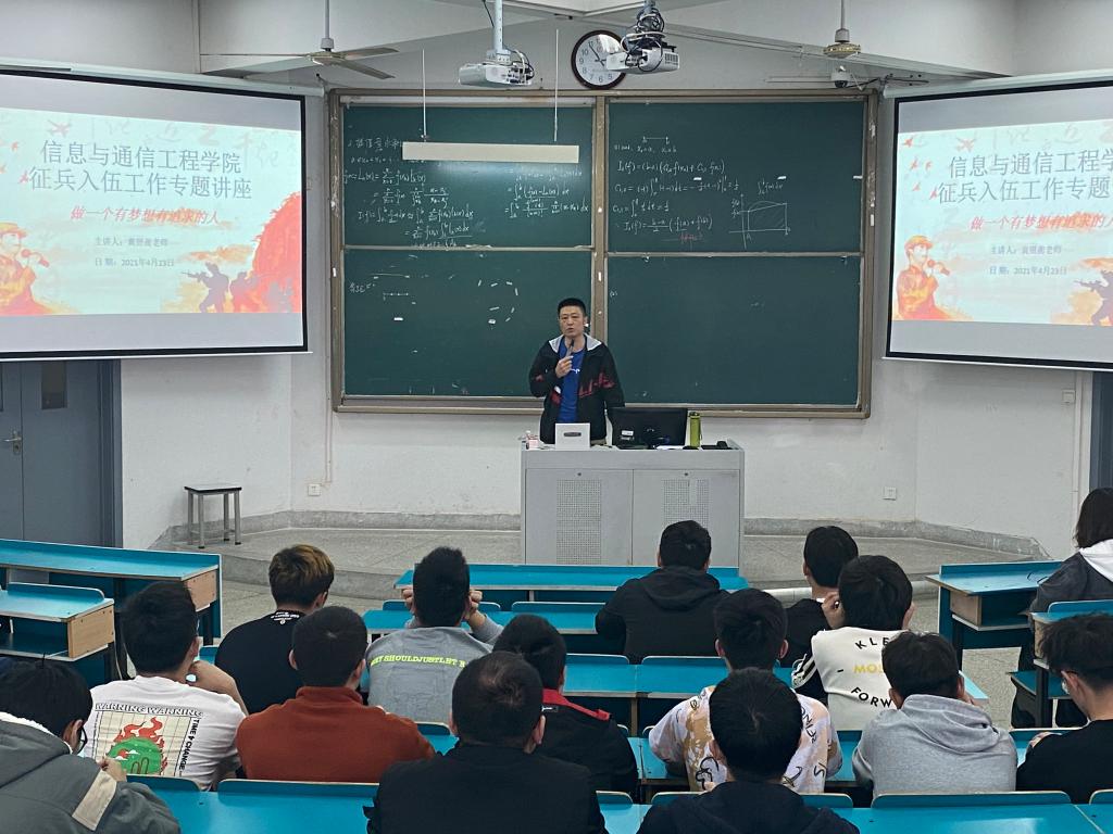 为进一步贯彻落实国家大学生征兵入伍政策,鼓励和引导信通学子应征入伍,4月23日,信息与通信工程学院在信息楼B201针对有意向参军入伍的学生召开了大学生应征入伍专题讲座。讲座邀请学生工作处黄照衡老师作为主讲。