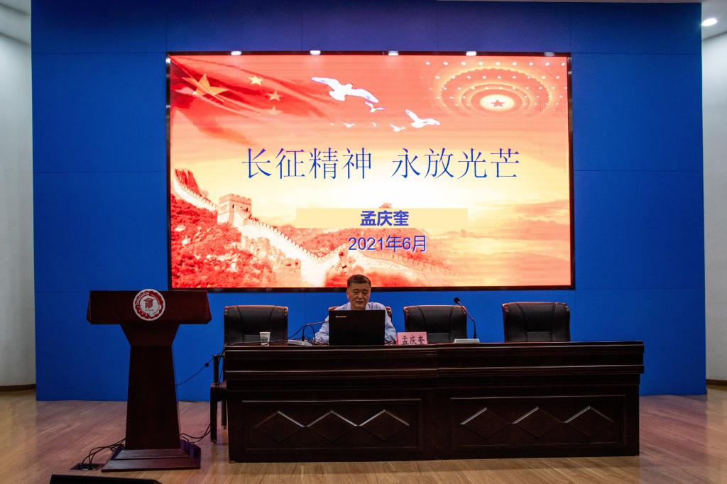 在报告会中,孟教授以“长征精神,永放光芒”为题,从长征的起因、艰辛历程、伟大意义、伟大精神与启示四个方面同学生党员们展开了交流。长征这一惊天动地的革命壮举,是中国共产党和红军谱写的壮丽史诗,是中华民族伟大复兴历史进程中的巍峨丰碑。孟教授表示,伟大的长征精神既是一个博大精深的思想宝库,又是一个取之不尽用之不竭的精神富矿。无论处在什么时代,无论从哪个方面进行发掘,都会产生新的震撼,受到新的激励。孟教授以一首《七律·长征》把两万五千里的万水千山串在一起,回顾了红军长征的艰难历程,歌颂了红军长征的伟大壮举,在场的同学和老师们都深受震撼。