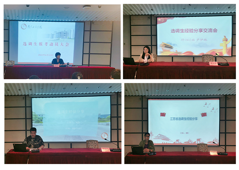 会上还邀请了参加过选调生考试的三位学长、学姐进行了经验分享。他们针对笔试、面试、考察等环节分享了自己的备考经验。他们认为,笔试环节要夯实基础,在有限的时间里尽可能提升正确率;面试环节要注重积累、自信大方、展现风采;考察环节要充分准备、知己知彼。