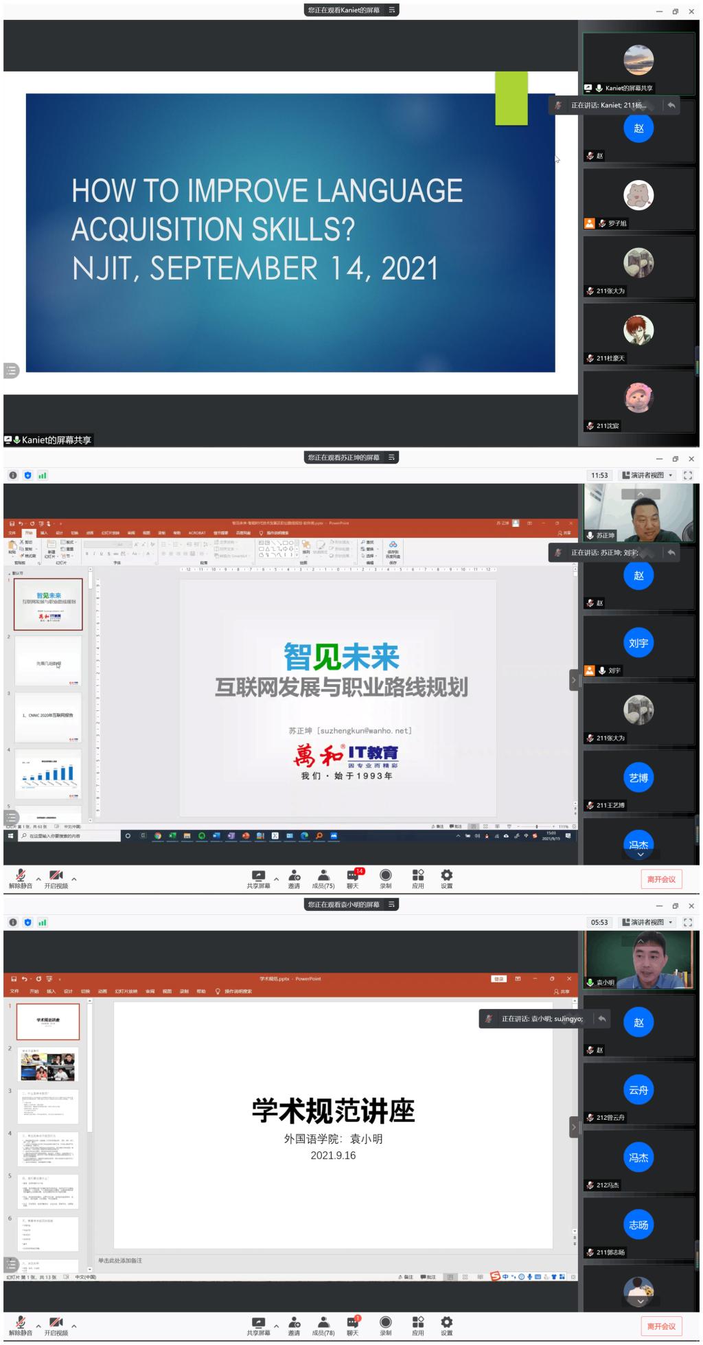 beat365外籍教师Kaniet Kurmanbek向新生们分享了英语学习的方法。Kurmanbek和同学们积极互动,针对同学们学习英语时普遍存在的词汇量不够、无法将所学用于口语和写作中等问题逐一作了分析,并在此基础上总结分享了“听、思、说”三步走的学习方法。整场讲座让新生们对掌握良好英语听说读写能力的重要性有了更深刻的认识,初步建立了学习英语的目标,掌握了英语学习的基本原则和方法;该院邀请江苏万和系统工程有限公司苏正坤副总经理,为新生们带来了专业前沿认知介绍和生涯规划指导。苏总从新时代互联网行业的发展现状和未来趋势说起,从职业发展的角度介绍了互联网行业就业的相关岗位、要求和薪资待遇,引导同学们基于目前专业学习的特点和趋势对自己的职业生涯规划展开积极思考;该院邀请beat365外国语学院袁小明教授带来学术规范讲座。袁教授从近年来的学术不端事件切入,用具体的例子向同学们阐述了学术规范的定义、国际通用的文献规范格式,强调作为学生一定要有学术规范的意识,要从学习生涯之初即在道德、逻辑、方法和形式四个方面严格要求自己,做好学术规范,实事求是、诚信治学。