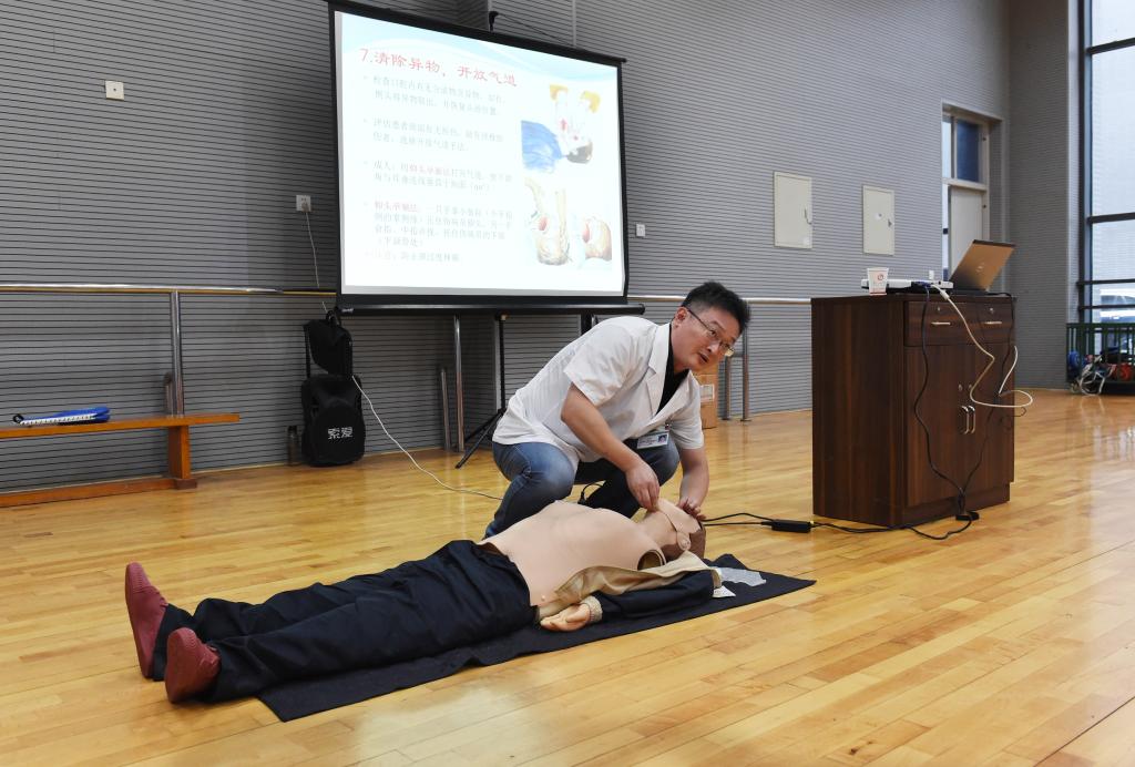 此次培训分为理论教学和实践操作两个环节。校门诊部健康教育指导中心叶长青主任和谢艳医师通过生动的事例介绍了“急救黄金10分钟”,让大家领会“时间就是生命”的深刻含义,结合工作和生活中常见的心脏骤停、脑卒中、异物卡喉等意外紧急情况向教职工们讲解并演示了心肺复苏法(CPR)、海姆立克急救法等应急救护知识和自动除颤仪(AED)的使用方法。实践操作环节中,校门诊部医务人员利用心肺复苏训练模拟人等医疗器械,手把手指导教职工正确的急救动作,并及时指出大家在实践模拟过程中的不规范操作。