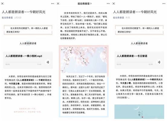 《今朝好风光》依托学院官方微信公众号“能动青春荟”,通过图片、文字、音频的形式,择优推送学生的朗读作品,带领能动学子体会了名家笔下中国传统节气故事中每个时节的美好。核工程201卞昱文朗读了《江南的冬景》后兴奋地谈及感受:“再读此篇让我体会到故事里的乐趣,了解了节气饮食风俗,感受到节气之美,更重要的是,我感受到了书籍和朗读的魅力,我们要读经典的书,做有根的人!”