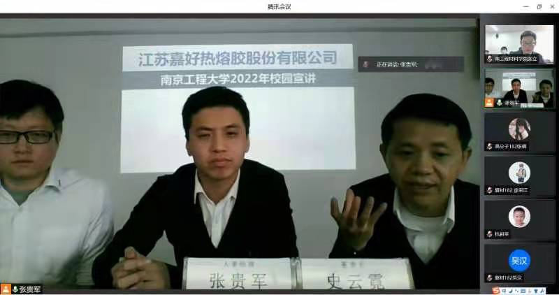3月3日下午,上海嘉好胶粘制品有限公司、江苏嘉好热熔胶股份有限公司、嘉好(太仓)新材料股份有限公司来到材料科学工程学院举行了招聘宣讲并应邀成为该院就业基地。本次宣讲会应防疫要求采用线上与线下结合的方式进行,由嘉好有限公司董事长史云霓、人事经理张贵军、技术经理王文敏与学院杭祖圣一同主持,应届毕业生线上参与,部分学生代表参与线下会议。