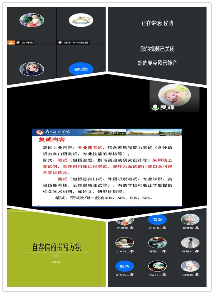 为更好地帮助2022届毕业生提高考研复试成功率,3月17日,环境工程学院通过腾讯会议平台举办“匠心逐梦,全力以‘复’——考研复试调剂指导会”,该院党总支副书记侯昀、考研博士指导团全体成员,学工办老师以及正在准备参加考研复试的2022届毕业生参加了此次会议。