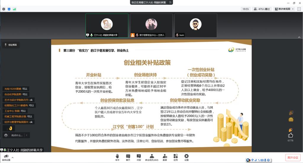 江宁区人社局人才服务中心周颖老师围绕“宁聚计划”全面详细地介绍了落户政策、面试补贴、住房租赁补贴以及江宁区“名校优生”等生活补贴政策;重点介绍了创业相关补贴政策,包含了开业补贴、场地扶持、创业担保贷款与贴息、江宁区“创客100”计划等切实有益于大学生创业的政策,吸引了同学们的关注。