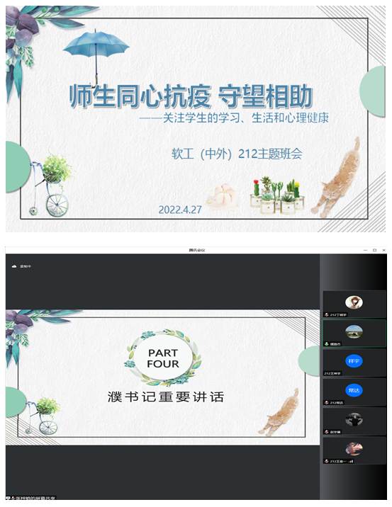 4月27日下午,校党委副书记濮励杰作为软工(中外)212班第二班主任与同学们云端相聚,了解校园封闭管理期间同学们的学习、生活和心理健康状况,勉励大家“携手建立一个团结、友爱、包容且奋发向上的班集体”。