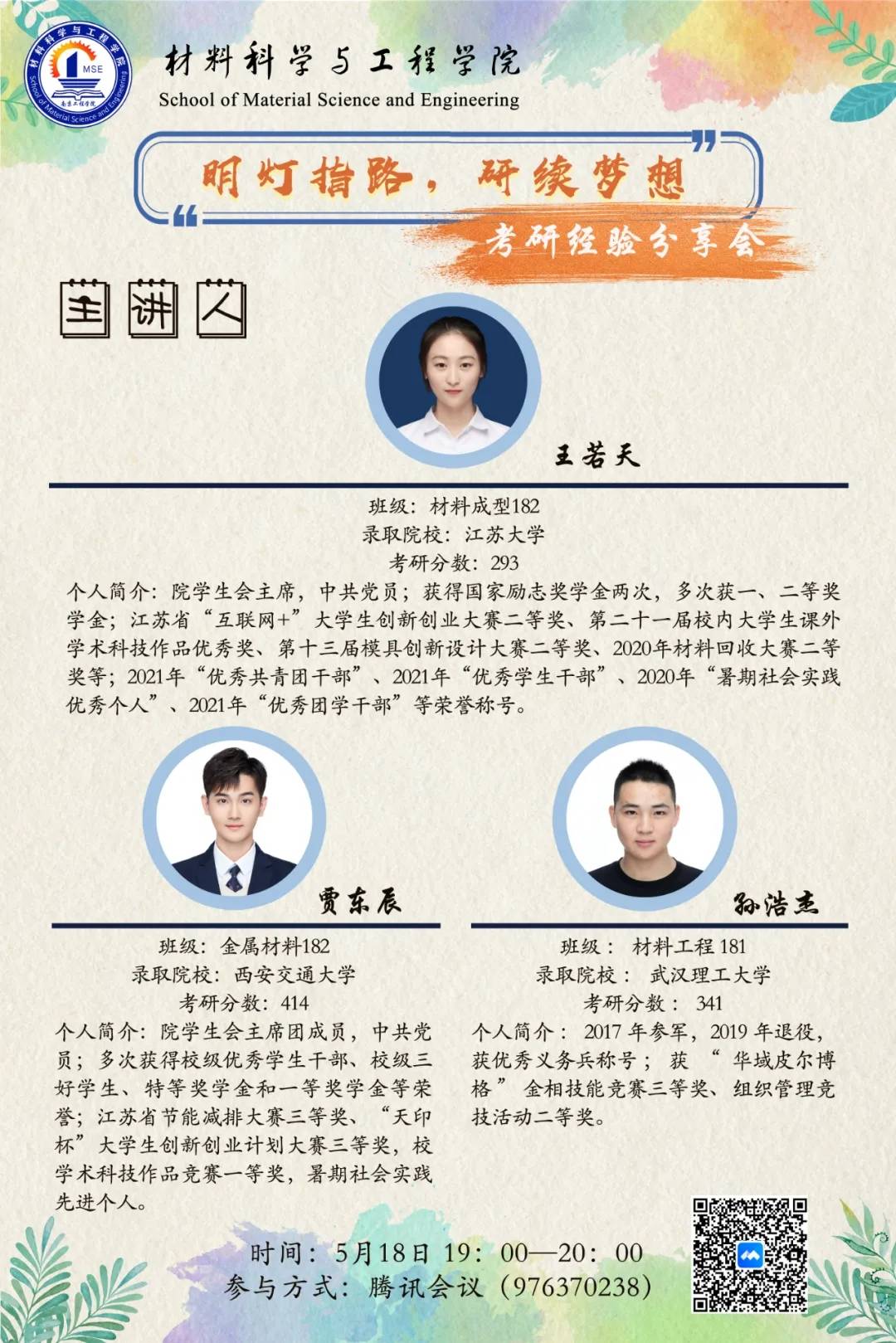 为帮助2019级学子解答考研困惑,掌握考研技巧,了解更多考研信息,近日材料科学与工程学院通过腾讯会议平台举办了“研途畅享,助力绽放”考研学习经验分享会。