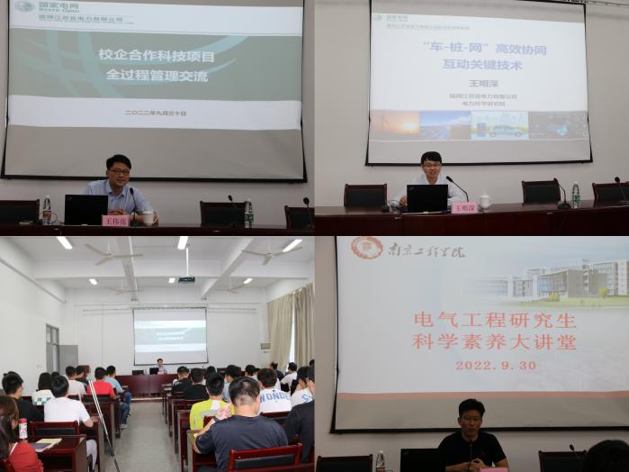 王伟亮博士以“校企合作科技项目过程管理交流”为主题进行分享,他介绍了国网公司目前关注的研究主题和热点,分析了国网公司科技项目指南、任务书的撰写流程,指出了国网科技项目申报、执行及验收环节的过程管理方式及容易出现的问题,对提高国网公司科技项目资助率及研究水平具有重要帮助。活动现场,王博士结合江苏电网的实际情况及自身工作经验,就科研及科技项目申报与学院青年教师、研究生同学展开了讨论。王明深博士就“‘车-桩-网’高效协同互动关键技术”与师生展开交流,从“高效协同充换电关键技术”“电动汽车智能引导控制研究”“电动汽车集群互动机制研究”“电动汽车产业发展展望”四个方面阐述了大规模电动汽车接入对电网的影响以及基于“车-桩-网”的电动汽车-电网协调控制技术。