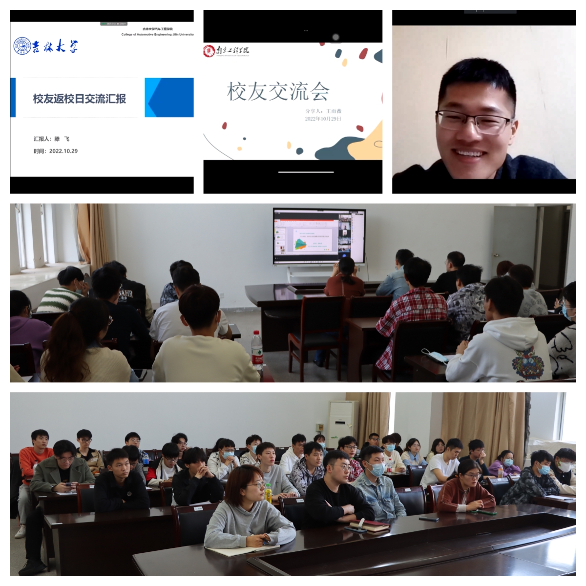 活动中,学院优秀校友、浙江工业大学教授、博导董红召为师生带来主题讲座“人生体验:面向社会发展需求的汽车领域研究焦点选择”,董教授深情回忆了自己的校园学习时光,他感恩母校的栽培,并表示在校学习经历为他后来的学习成长起到了关键性的作用,让他把握到了一个又一个人生发展的重要机遇。董教授介绍了自己的学术研究心得,他认为学术研究应该基于社会发展目标和需要选择方向,在研究过程中认真观察、高度专注、深入思考,方能取得丰硕成果;青年校友2017届高畅、2019届滕飞、2020届王雨薇通过“云”端畅谈自己的成长心得,回溯汽轨岁月,勉励学弟学妹们做好学涯规划和职业规划,珍惜校园时光,奋勇争先。