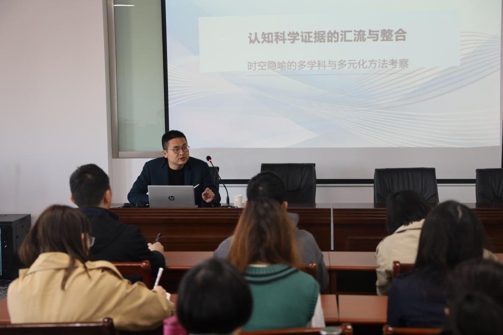 李恒教授讲解了认知语言学中的时空隐喻研究,强调了空间经验的重要性,他围绕“时间在动”和“自我在动”两个不同隐喻视角,重点阐述了“真实运动”“虚拟运动”“抽象运动”研究及相关实验,指出时间的空间表征受到生活场景、运动经验、情绪、人格等多种因素的影响,从而表现出较高的灵活性和随机性,此差异可通过“时间焦点假设理论”得到解释。李恒教授的讲座引起了与会师生的兴趣,在讨论环节师生们就时空认知的研究路径展开了进一步探讨。