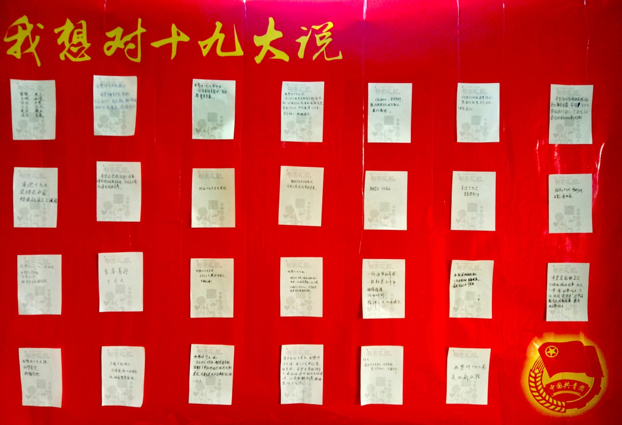 环境152、电环171、水质171等团支部共同发起“心系十九大心语心愿”活动,话题一经发出,就引发了广大团员的热烈讨论和广泛参与,青年学生们在心愿墙上写下对党的祝福、对党的十九大的祝贺。环境152团支书席肖同学这样写道:“习近平总书记讲到我们进入新时代的话语鼓舞人心,心中的国家自豪感无比高涨,我为中国骄傲。”100多名青年学生以书写祝福的形式,用心写下对祖国母亲、对党的祝福和对自己成才发展的规划,把自己的个人发展与国家发展变化相结合,深情歌颂共产党,以实际行动迎接新时代,祝福十九大。