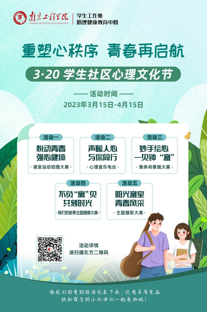 为进一步加强大学生心理健康教育引导,将心理育人工作融入“一站式”学生社区建设,提升学生的心理自助与互助能力,培育自尊自信、理性平和、积极向上的健康心态,学生工作处举办为期一个月的“重塑心秩序,青春再启航——3·20咱爱您”学生社区心理文化节,得到了全校学生的积极参与。