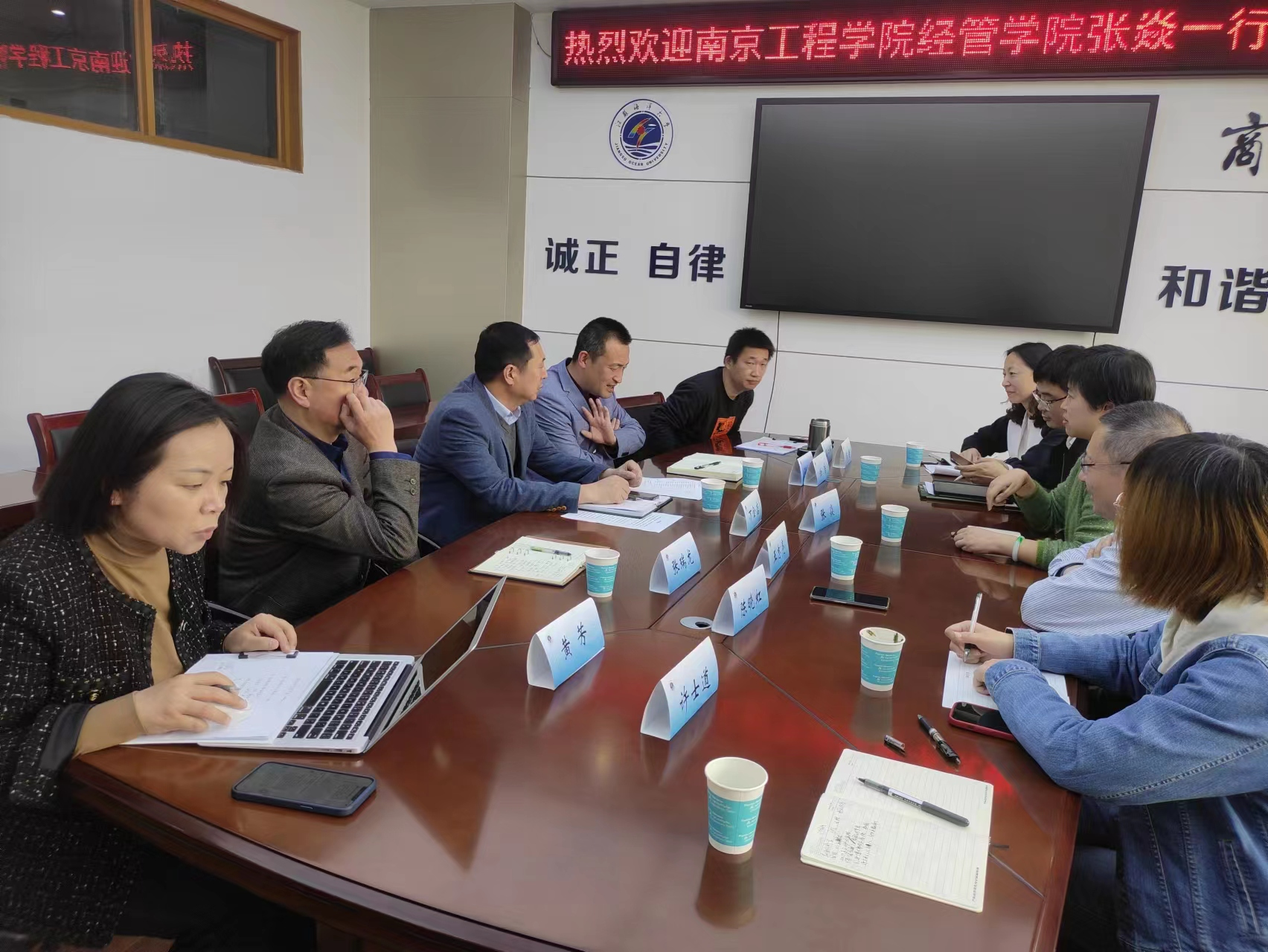 4月14日,经济与管理学院张焱院长、王志亮副院长一行赴江苏海洋大学商学院开展申硕工作专题调研,江苏海洋大学商学院万金店书记、孙军院长、张瑞龙副院长、翟仁祥副院长等对张焱院长一行进行了热情接待。