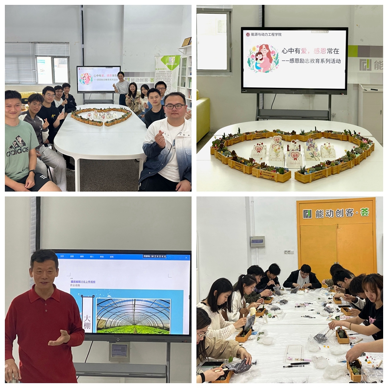 “在小小的花盆里挖呀挖呀挖,种萌萌的多肉送给妈妈……”在母亲节到来之际,同学们用小铲子翻动泥土,把一个个多肉绿植栽种进花盆里,也把对母亲深深的爱藏于其中。5月12日上午,能源与动力工程学院在工程实践中心9号楼101会议室开展感恩励志教育活动。该院党委副书记朱正林、关工委辛洪祥老师、全体学工办辅导员及20余位同学参加此次活动。