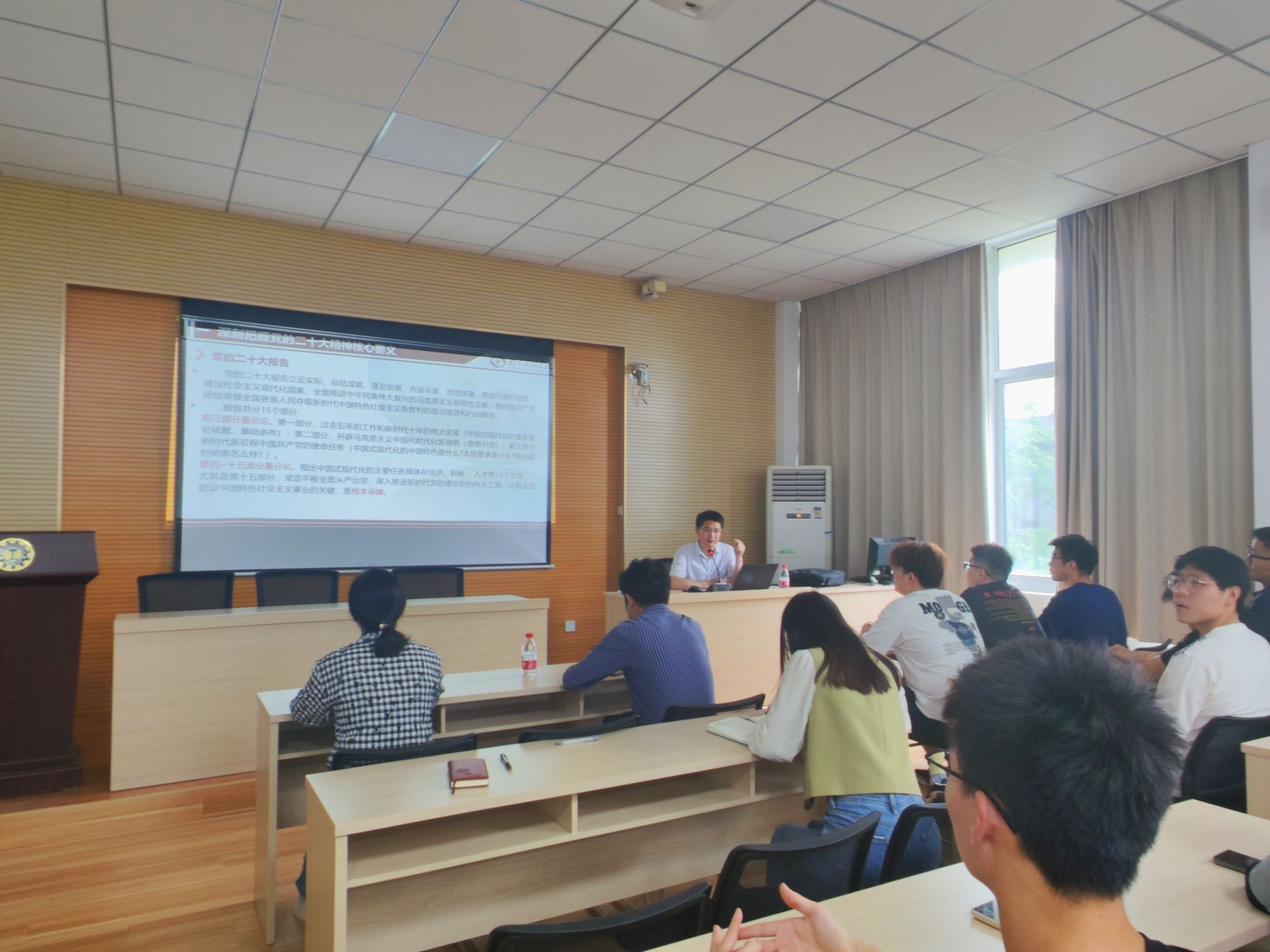 为扎实开展学习贯彻习近平新时代中国特色社会主义思想主题教育,按照学校主题教育小组统一安排,5月17日,校党委常委、党委组织部部长、机工201班第二班主任朱松青,以“学习贯彻党的二十大精神,争做有理想敢担当能吃苦肯奋斗的新时代好青年”为题,在工程实践中心2-201为机工201班全体同学、师生党员代表及学生骨干等讲授主题教育专题党课。