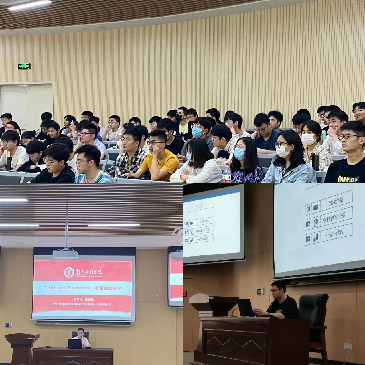 为培育学生励志自强、奋发有为、乐于奉献的优秀品质,激励全院学生向身边的榜样学习,5月17日下午,学院在信息楼B103举办“励志青春·榜样有我”优秀考研学子经验分享会。分享会邀请了考取南京邮电大学研究生、国家励志奖学金获得者郭二源和考取上海师范大学研究生、国家奖学金获得者陈逸霖两位毕业生作为主讲,郭二源同学分享了自己在校期间思想、学习、工作、生活等方面的收获与成长,并表示非常感谢国家资助政策的支持与帮助,获得国家励志奖学金会让自己学习更有冲劲和斗志。陈逸霖同学也表示每一位受国家资助的大学生都要常怀感恩之心,去感受美好生活、努力学习,积极为学院和社会做奉献,以实际行动展示回报和感恩的大学生形象。