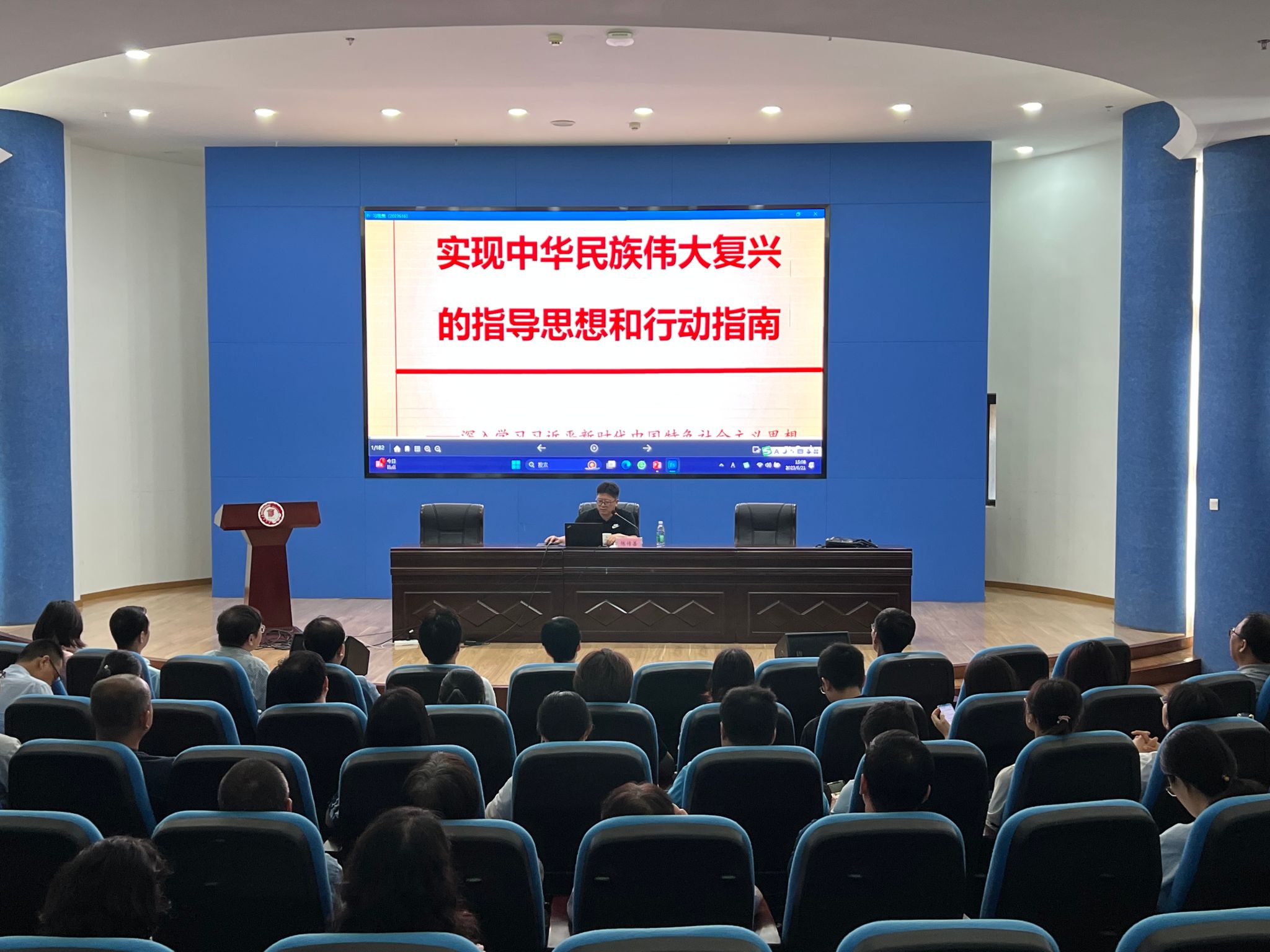 陈传善教授主要从事习近平新时代中国特色社会主义思想教学与研究。近年来主持中组部《西方社会思潮对基层党建工作的影响》等课题多项,著有《当代视野中的公民社会问题研究》《民主执政的路径依赖》等作品。陈教授围绕“深刻认识习近平新时代中国特色社会主义思想的时代背景”“全面把握习近平新时代中国特色社会主义思想的科学体系”“切实践行习近平新时代中国特色社会主义思想的实践要求”三个方面,以丰富的史料、生动的事例结合近代史、新中国史和百年党史进行了系统讲解和深入阐释。在场的老师们进一步了解了中国共产党带领中国人民走过的艰苦卓绝的风雨历程,铭记了百年来中华民族摆脱贫穷落后、逐走向繁荣富强、取得的辉煌成就,也更深切地明白了中国共产党承担着深刻改变近代以后中华民族发展的方向和进程、中国人民和中华民族的前途和命运、世界发展的趋势和格局的历史重任。中国特色社会主义道路是中国人民的历史选择,是实现中国梦的必由之路。陈教授指出,中国特色社会主义理论体系是指导党和人民沿着中国特色社会主义道路实现中华民族伟大复兴的正确理论,是立于时代前沿、与时俱进的科学理论,习近平新时代中国特色社会主义思想是全党全国人民为实现中华民族伟大复兴而奋斗的行动指南,要把学习习近平新时代中国特色社会主义思想的基本观点、科学体系、世界观方法论等贯穿主题教育的始终。