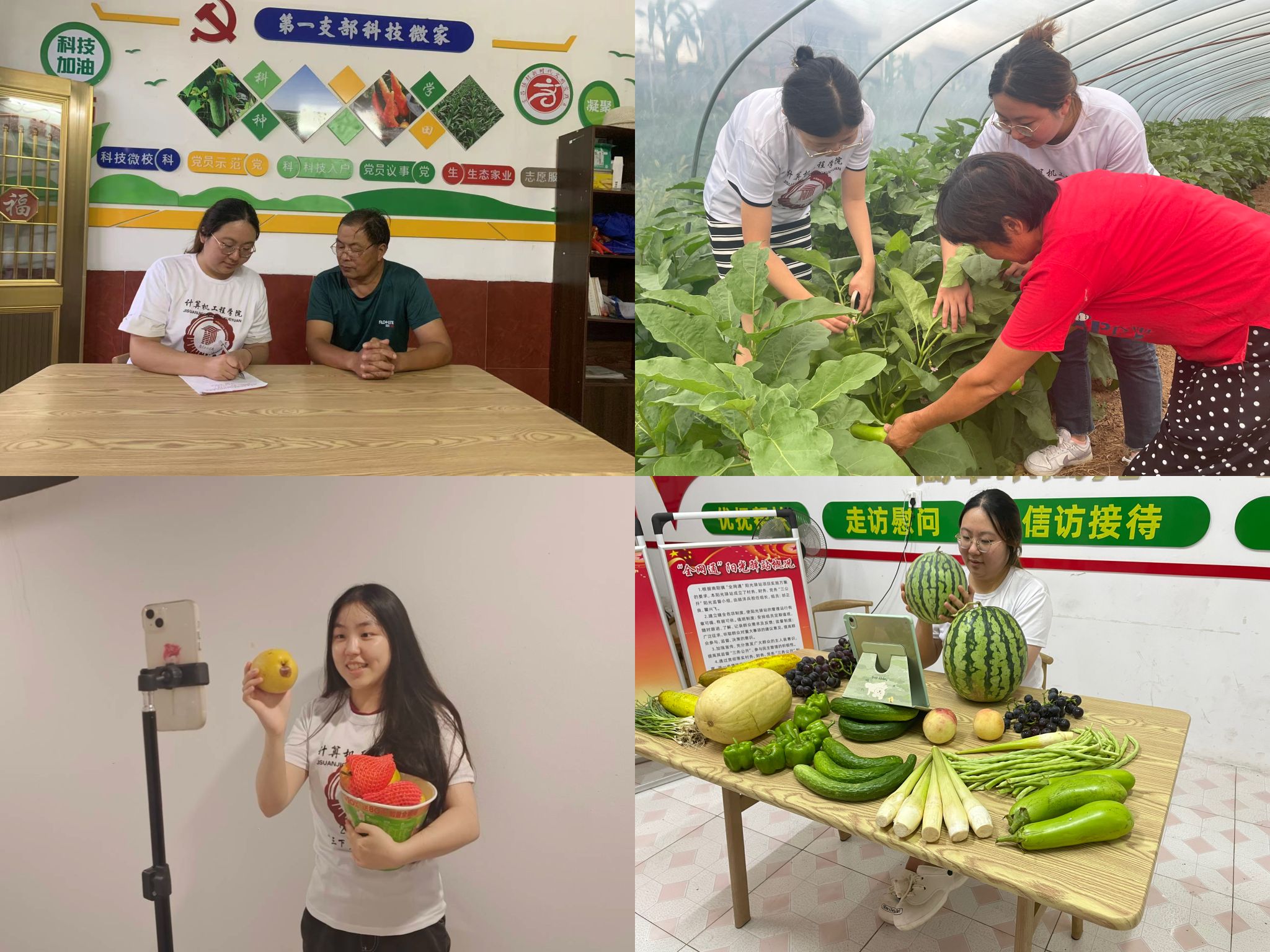 感受“沧海桑田”,直播助力振兴。7月19日,团队成员前往被誉为“沧海桑田”的国家级传统村落南通市南莫镇唐庄村,围绕唐庄村建设生态田园村落、创新性发展传统农业推动乡村振兴为主题展开调研。团队成员通过参观唐庄村西瓜大棚、葡萄园,采访村委会工作人员,亲手体验采摘葡萄,浇水,除草等过程,充分感受到唐庄村致力于融合传统与创新,形成独具巧思的特色农业。在实地调研后,团队成员创新性采用“直播带货”的方式助力打造传统特色农业品牌,以实际行动切实帮助传统村落扩大经济来源。“我们的农产品生产利用自然能源,完全实施避雨栽培技术、节水灌溉技术、配方施肥、标准化生产技术,能使产品附加值大幅提高。”网络213班顾婷挺运用实物讲解和现场操作相结合的形式,热情洋溢地向直播间的观众详细介绍当地农产品的发展历史、产业规模、特色优势等,为观众呈现了更清晰、更真实的直播效果。