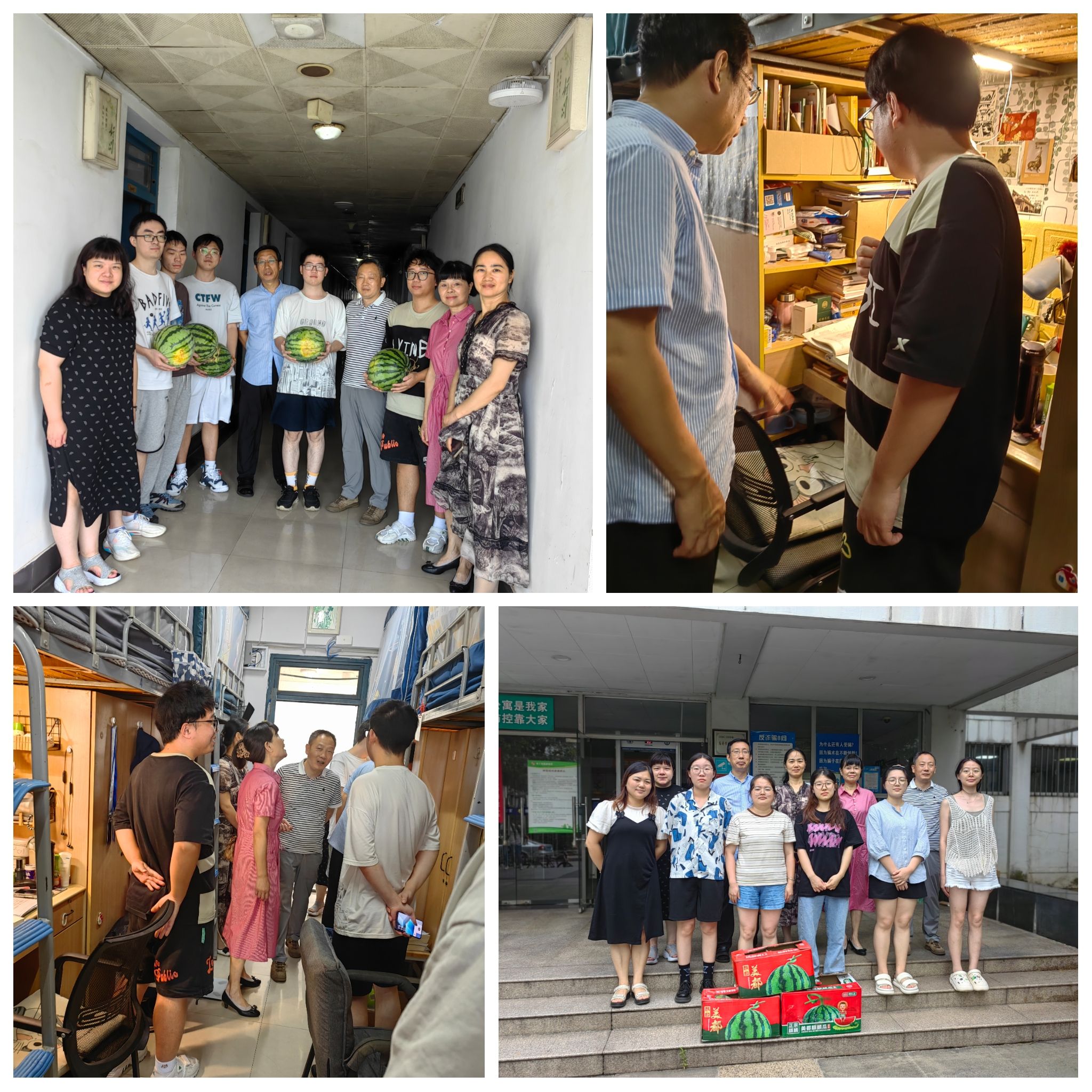 为关心暑期留校学生学习生活,鼓励学生坚定考研信念,保持学习热情,7月29日下午,环境工程学院全体党政领导、离退休教师颜萍和学工办辅导员一起深入学生宿舍,走访看望55名留校考研学子,了解他们的暑期学习生活情况,并为他们送上了夏日清凉的“加油瓜”。