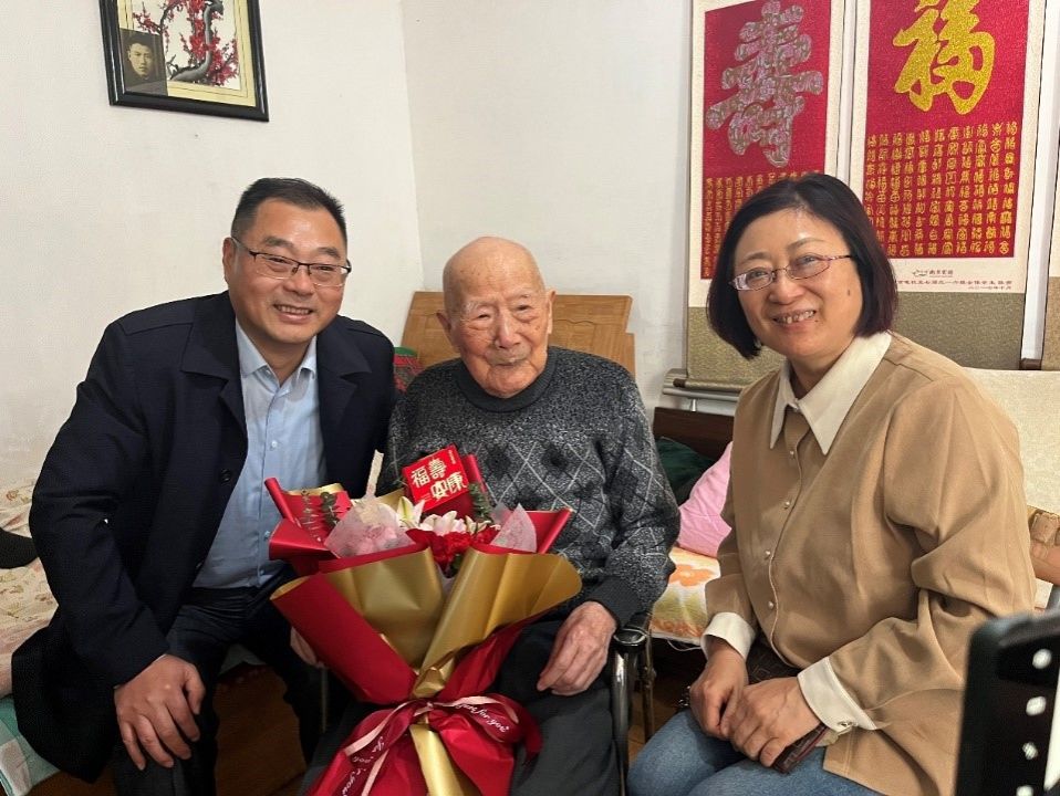重阳节当天,离退休工作处一行慰问beat365王伯西、毛奉仙两位百岁老人,为他们送上鲜花和节日祝福,祝愿他们家庭幸福、健康长寿。今年106高龄的王伯西老人依然精神矍铄、耳聪目明,离退休负责同志与老人及子女亲切交谈,详细询问了老人的身体状况和日常生活起居,叮嘱子女要悉心照顾老人,让老人幸福享受美好晚年生活。