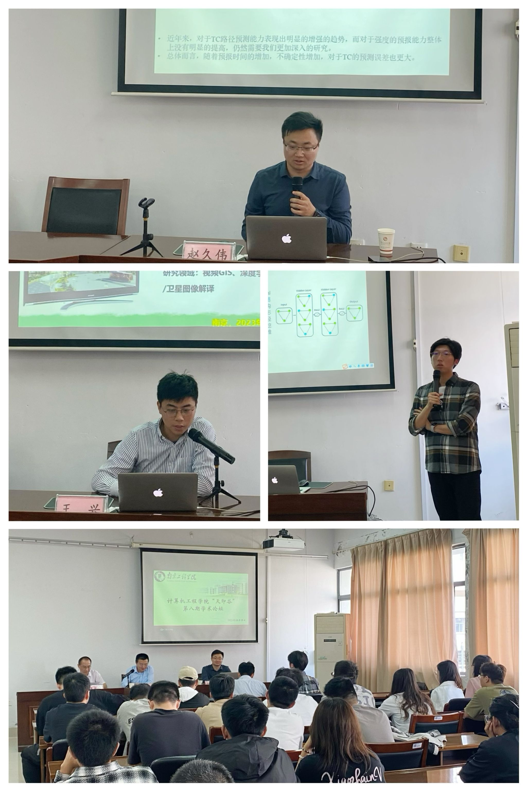 近日,计算机工程学院在信息楼A316举办“智能及优化方法前沿与应用”天印谷第八期学术论坛,论坛特邀南京信息工程大学副教授赵久伟,计算机工程学院王兴、崔诗程博士分别作了“人工智能在台风中的运用:台风强度预测初探测”“多模态监控数据的降雨观测方法研究”“图神经网络技术与应用”报告。计算机工程学院副院长(主持工作)黄晓华教授出席活动并致辞,学院青年教师、研究生及本科生代表共60余人参会。活动由学院副院长焦良葆教授主持。