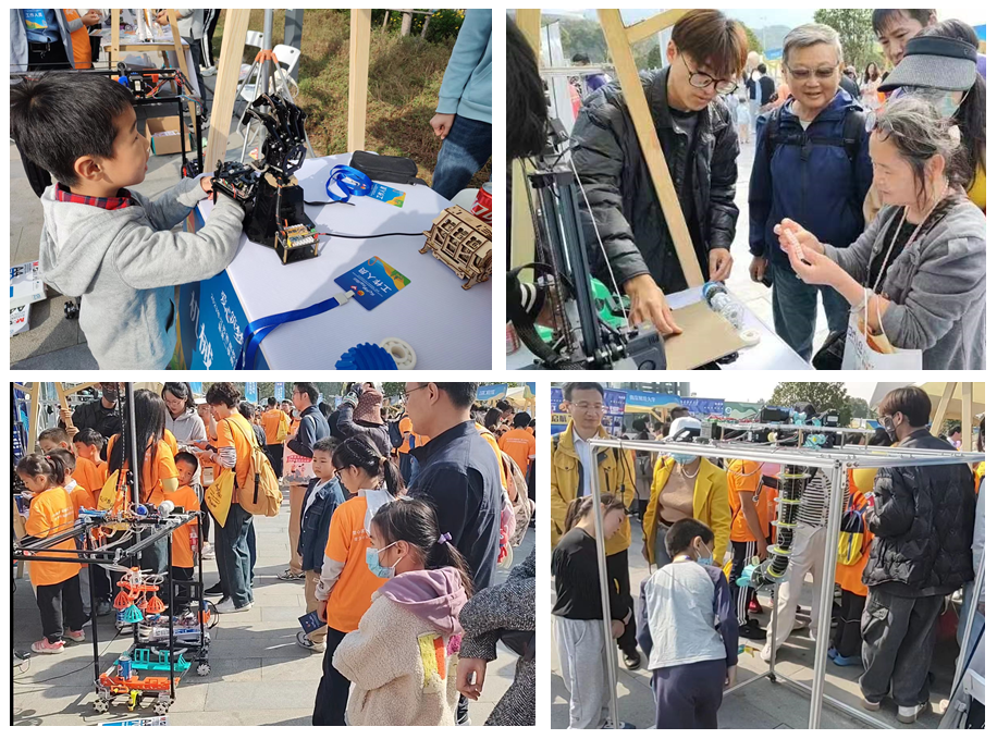 活动现场,机械“小种子”志愿服务团队在马银忠、苏松飞、孙梦馨和郑璐恺四位老师的带领下,展示了自主设计制作的科技作品、好玩新奇的3D打印玩具、灵活多变的象鼻机器人、智能高效的物流搬运机器人、动感炫酷的机械手等作品,吸引了大量家长和小朋友驻足观看。团队成员在现场向小朋友们讲解这些科技作品的工作原理,鼓励他们参与互动游戏,引导小朋友对科学技术的兴趣。团队成员还借此次机会与参展的各家高校代表现场交流学习,并表示要继续努力学习科学文化知识,不断提升志愿服务专业化水平,为科技进步和社会服务做出更多贡献。