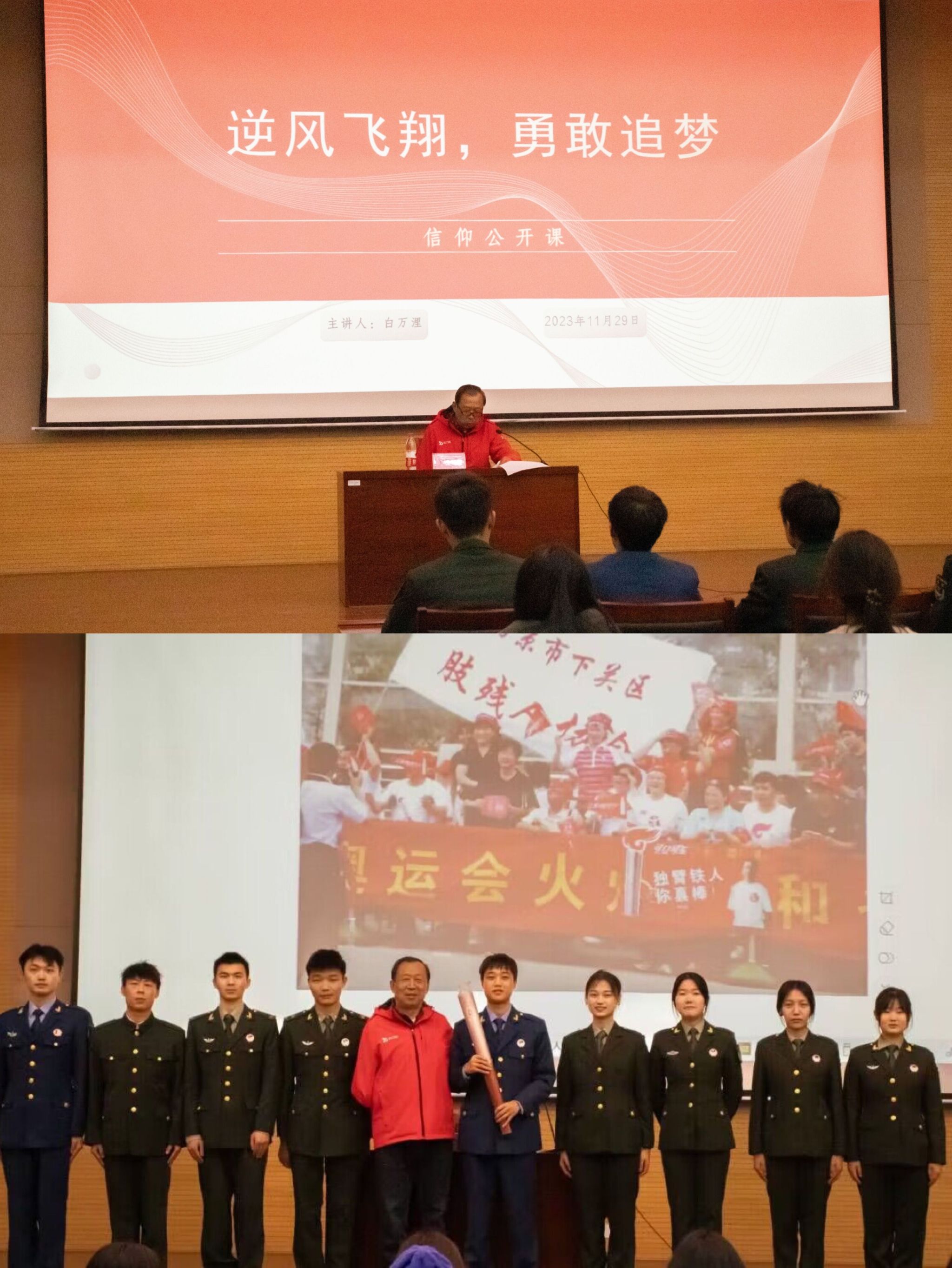 “一个用一只手臂,骑车追赶太阳的人,更能让太阳温暖大地……”11月29日下午,一场别开生面的信仰公开课在至美苑·设计楼动漫影视厅进行。电力工程学院特邀原任南京市鼓楼区政协常委、残联副主席、2008年奥运火炬手白万浬作为主讲,学生党员、团员代表、“迷彩英才”退役复学大学生办公室学生代表等200多名学生现场聆听。
