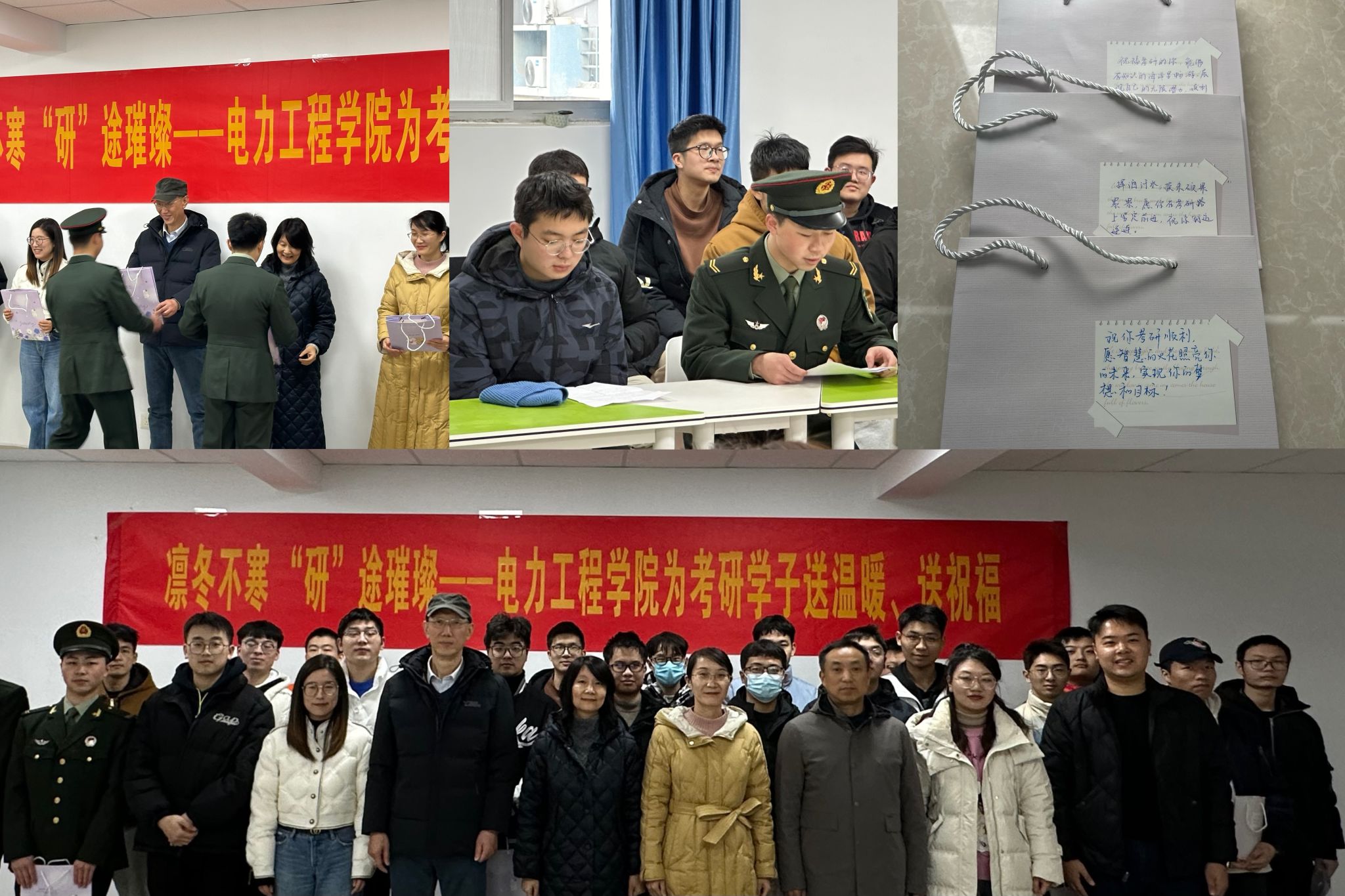 活动中,学院副院长(主持工作)刘海涛祝福同学们都能取得优异的成绩,希望同学们在关键时刻照顾好身体,以良好的状态备考,同时在冲刺阶段做好查漏补缺工作。关工委韩念杭老师以切身经历告诉大家考研的必要性和重要性,祝福同学们旗开得胜,考上自己心仪的院校。退伍考研学生、继保201班李金坪表示感受到了来自学院的爱与温暖,接下来的时间会专心备考,争取“一战成硕”。会后,各位老师为考研学子代表送上了写满祝福语的大礼包,希望载满深深情意的礼物能够增强同学们的迎考信心。