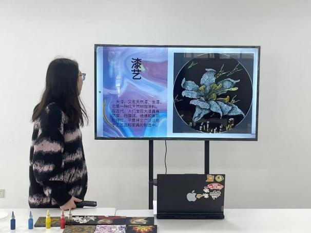 “艺”心向党,落漆为行。在东十“一站式”社区服务站,该院品艺学生党支部党员、工艺美术202班王怡同学用自身扎实的专业知识和专业技能为师生带来“漆艺小课堂”,她解读了漆艺的缘起和相关知识点,并带领现场师生以扇为纸、以漆作画,进行了飘漆扇、飘漆书签的制作,通过调漆、试色、漂漆以及二次美化,最终呈现出精美灵动而各有韵味的作品。大家热情高涨,气氛十分热烈,纷纷表示在本次活动中感触颇深、受益良多,不但了解了漆艺的基本知识,还认识了传统大漆工艺技法与现代审美相结合的产物,涵养了文化内涵。