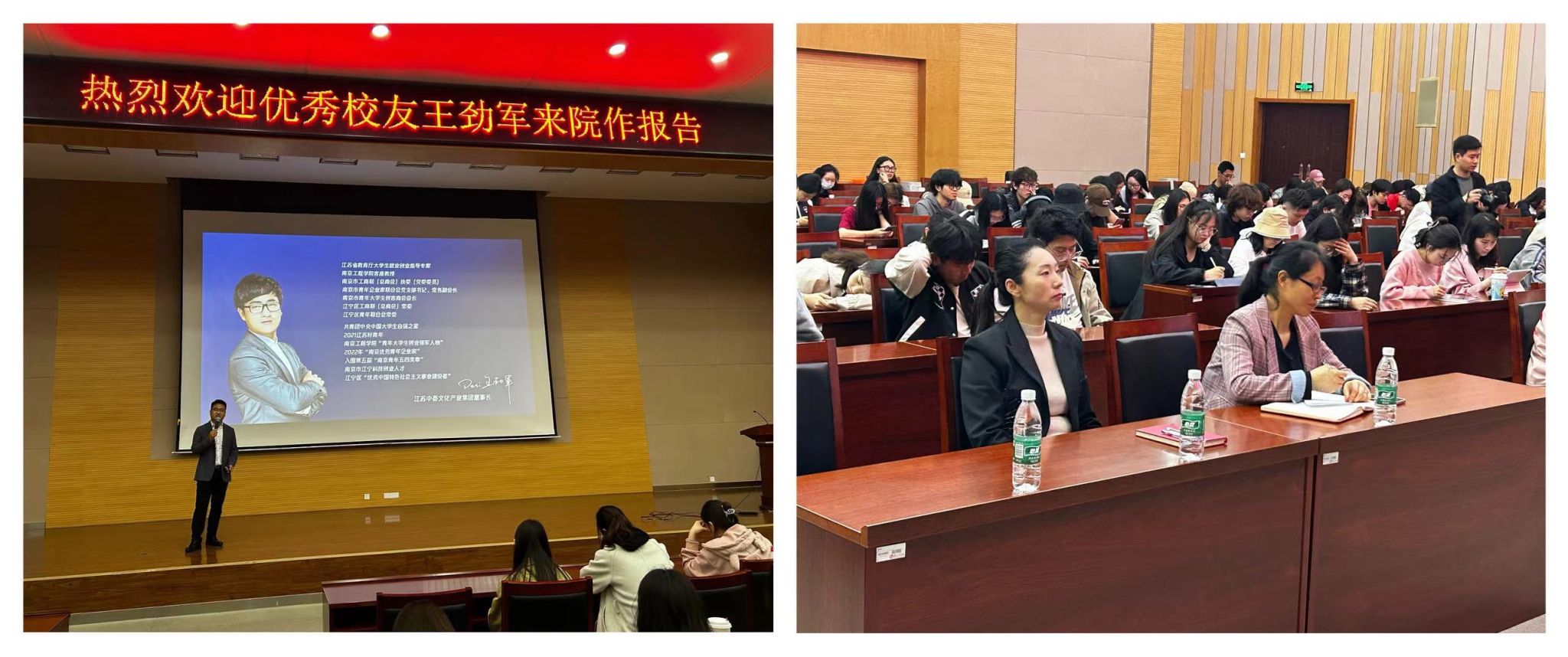 会上,王劲军表达了重返母校的激动与感谢之情,为母校师生良好的精神面貌感到振奋与骄傲。他以“不忘创业初心,奋斗书写青春”为主题,通过“刻苦学习自强不息,创业改变人生命运”“搭建平台抱团发展,助力南京创新创业建设”“积极投身公益事业,展现青年一代责任与担当”三部分,结合自身校园生活学习、学生干部任职和创新创业经历,勉励在座各位学弟学妹们要坚定理想信念,端正学习态度,认清自身能力,立足于艺术设计类专业领域,只要能吃苦、肯钻研就能成功。“学长的分享让我们对当前专业的就业环境、发展前景有了更深的了解,今后一定会做好学业规划、端正自身态度、加强专业学习、投身社会实践、参与科创活动,努力成长为对祖国有用的人。”活动现场,同学们就关心的问题积极提问,并得到王劲军校友的热情解答。