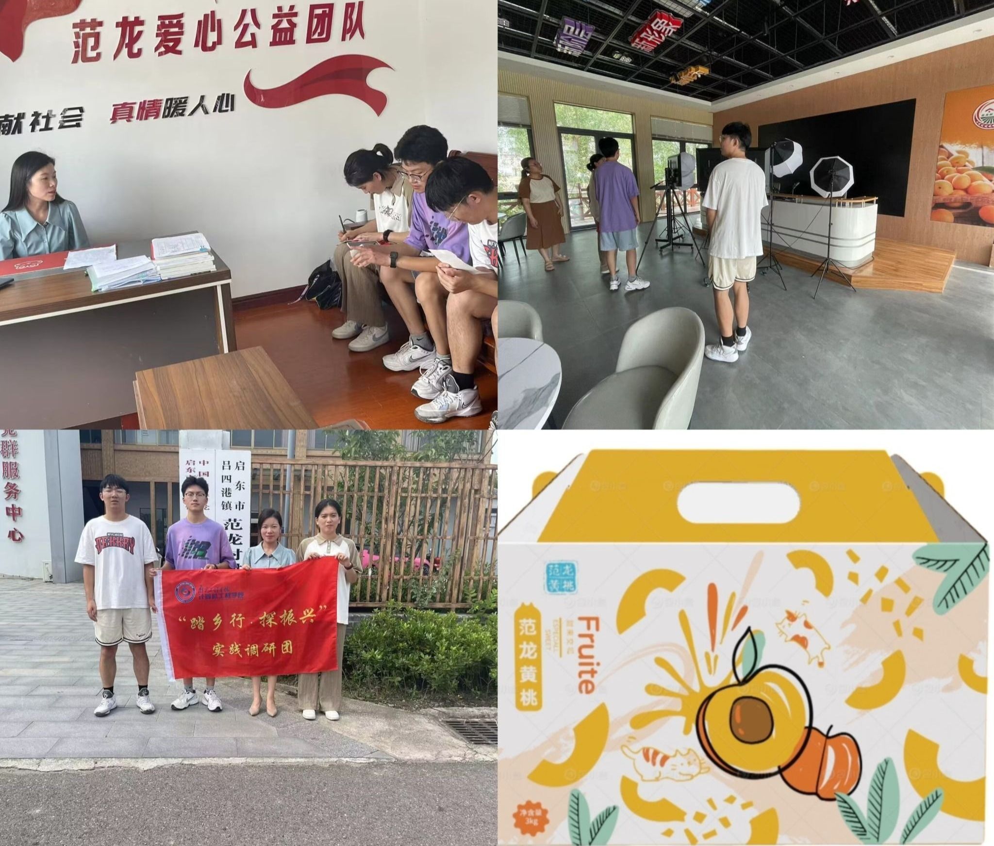 在省特色田园体验村范龙村,党支部书记王丽萍向成员们讲述当地发现种植黄桃的契机和故事,并介绍近年来村党总支因地制宜,鼓励村民种植黄桃果树,已经形成了超千余亩集种植采摘销售一体化完整的黄桃特色产业。团队成员在工作人员带领下参观了范龙村村史馆,进一步感受当地传承革命英烈精神,不断探索乡村振兴产业发展新路径。在黄桃网络销售直播间,成员们积极发挥自己的专业优势,为范龙黄桃设计专属的品牌logo及包装盒,为当地黄桃销售贡献自己的一份力量。