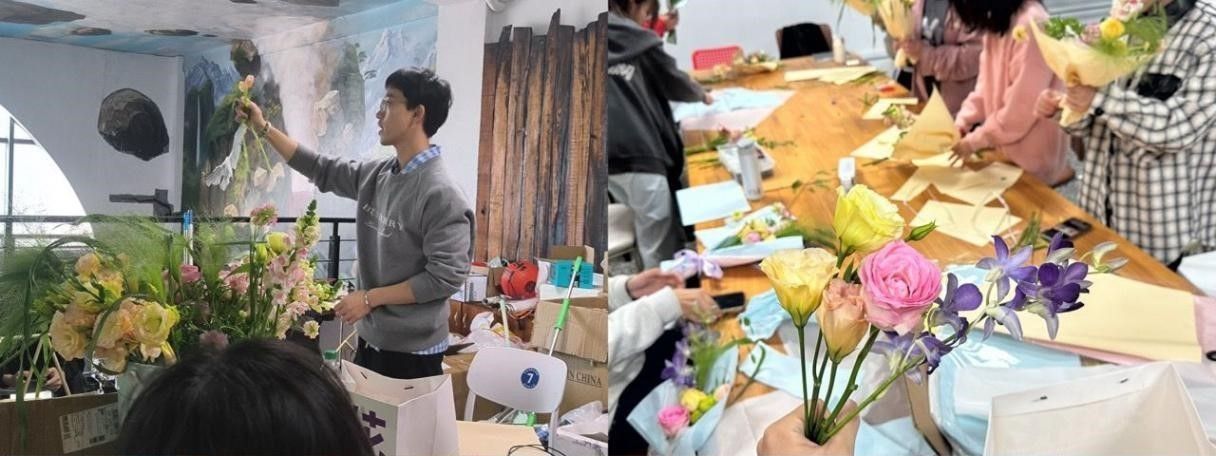 活动中,周老师向同学们介绍了花艺的来源、发展的历史概况、中国传统插花艺术等,将中华优秀传统文化融入其中,结合自己的作品及其他案例详细讲解了色彩搭配、形态变化、操作技巧、花材养护等理论知识,带领大家辨认花材,示范花材修剪养护的方法,使学生们对形态各异、颜色丰富的花材搭配有了更深入的了解。在动手实操环节,同学们纷纷挑选自己喜爱的花材,结合花材形态与寓意,融入自己的灵感进行创作,整个活动气氛活跃,在花束的制作中感受生活的美好和花艺带来的“新鲜感”“满足感”,同学们纷纷表示看着自己亲手制作的花束整个心情都好了。