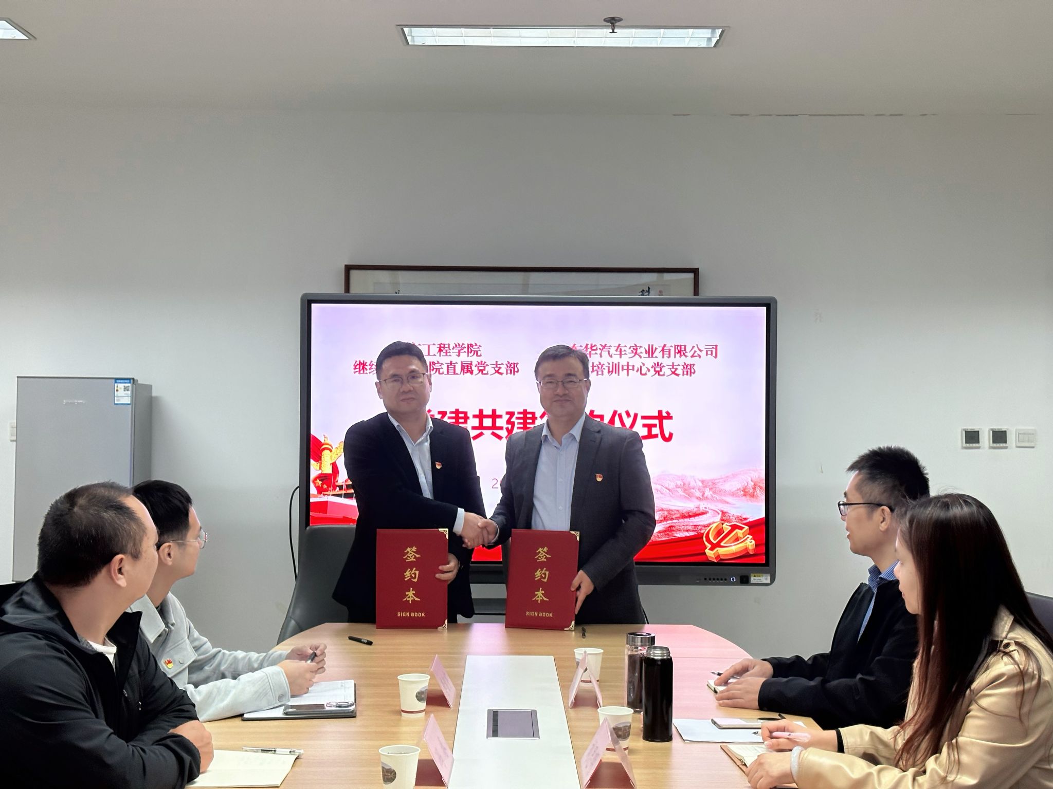 会上,继续教育学院直属党支部书记罗俊和东华汽车实业有限公司培训中心党支部书记翁一明共同签署了支部共建协议。随后,双方以“党建引领,携手并进,共谋发展”为主题,围绕党组织联学联建、业务合作创新、项目联合开发等方面进行了深入交流。双方一致认为,要强化党建引领,将支部共建作为推动校企双方合作发展的重要载体,通过资源共享、优势互补,充分发挥各自在高校、企业主阵地开展各类继续教育实践所积累的独特资源与经验,促进教育链、人才链与产业链、创新链的有机衔接,努力培养更多符合社会需求的高素质应用型、技能型人才。