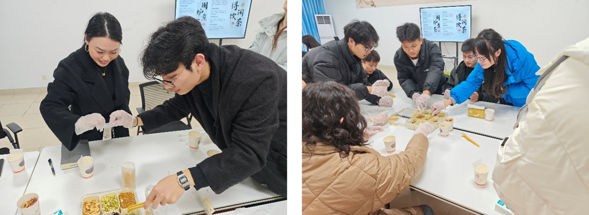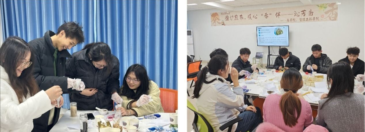 茶香氤氲,满室生温。“早喝水,晚喝蜜”“早起晒太阳,晚上泡泡脚”“早睡晚起,早饭晚吃,晚饭早吃”……活动中,现场师生共同聆听“冬日养生小讲堂”,并开启围炉煎茶时刻。每张桌子上既有枸杞、茯苓、龙眼、黄芪、姜糖等冬日补气暖身的茶饮药材,也有桂花、茉莉、玫瑰、洛神、胎菊等馥郁芳香的花茶食材,在心理部干事的讲解下,老师和同学们纷纷动手实践,搭配出专属于自己的冬日暖心茶。伴随着空气中淡淡的花茶芬芳,大家手捧热茶,心扉渐敞,老师、同学们交流中流露出的温馨与暖意让活动现场满室生温。
