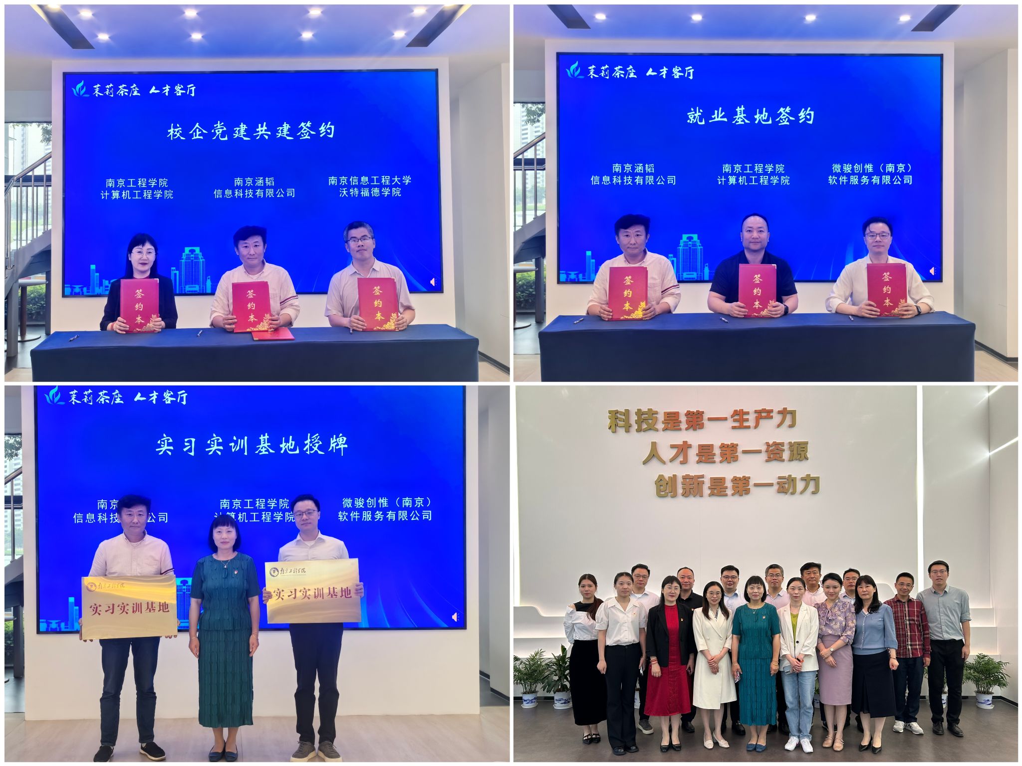 在签约环节,学院与微骏创惟、涵韬信息科技签署了校企党建共建协议、就业基地协议,并授予“实习实训基地”牌匾,标志着双方在人才培养、实习就业等领域迈入实质性合作阶段。