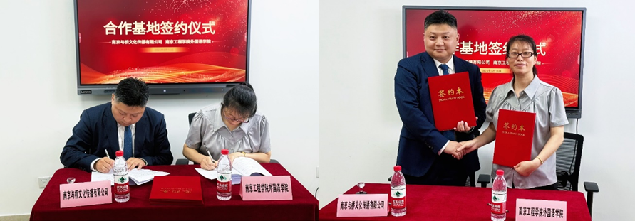 南京联硕国际文化交流有限公司执行董事施建军详细介绍了公司的基本情况、发展历程及人才需求,期待在促进学院教师出国、学生访学交流与出国升学服务、国际性活动志愿服务等方面合作。南京与桥文化传播有限公司负责人夏治提出共建“青翼计划”实训基地,联合开发“演讲力培养”“高情商沟通”等系列职业赋能特色课程,助力培养具有国际视野和跨文化沟通能力的复合型人才。张相琼表示学院将依托“新文科”建设,加强优化人才培养方案,提升人才培养质量和学生国际化素养,希望与企业在提升学生国际视野、就业实习等方面深化合作,进一步提升企业用人需求的契合度。双方现场签订就业育人、共建基地等合作协议,并为大学生就业(实习)基地揭牌。